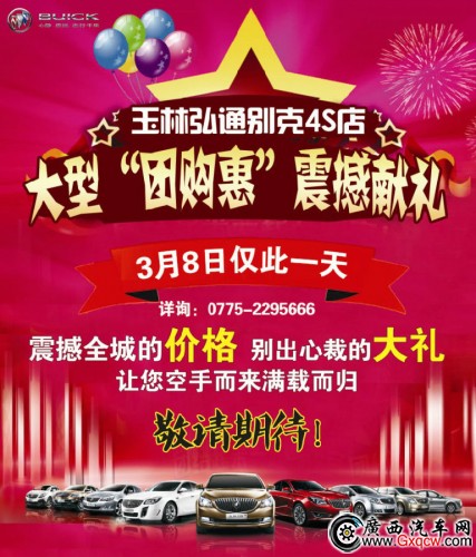 春意盎然,鉅惠來襲!2014年3月8日,玉林弘通別克4S店將舉行大型“團(tuán)購惠”震撼獻(xiàn)禮活動,僅此一天的活動將精心奉上進(jìn)店關(guān)注禮、女士特別禮、購車幸運(yùn)禮、限量特價、尊貴貴賓禮禮等10重驚喜,為打算購車的朋友提供了一次難得的機(jī)會,趕緊報(bào)名參加吧!