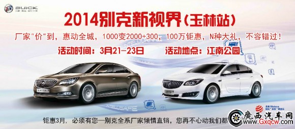 2014別克新視界——由別克傾情奉獻(xiàn)的一站式品牌體驗(yàn)及購(gòu)車平臺(tái),搭載“盡情向前”的磅礴動(dòng)力,將鉅惠開啟,廠家直銷,超乎想象,不容錯(cuò)過!2014年3月21日至23日,玉林市江南公園別克展場(chǎng),誠(chéng)邀您參與!同時(shí),即日起—3月23日,只要轉(zhuǎn)發(fā)本條活動(dòng)信息至朋友圈,并集滿20個(gè)“贊”即可獲得玉林弘通別克4S店為您精心準(zhǔn)備的禮品。