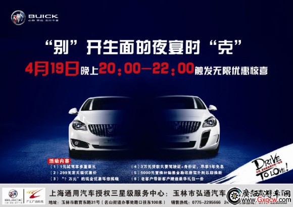 4月19日晚上20:00-22:00,2014年度的別克夜宴隆重登場,為您展開一場“別開生面”的特別購車行動,店內英朗GT現(xiàn)車銷售,顏色可選,觸發(fā)無限的優(yōu)惠驚喜,優(yōu)惠絕對2萬元以上!速速報名吧! |
