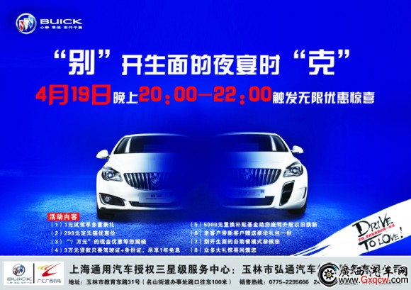 4月19日晚上20:00-22:00,2014年度的別克夜宴隆重登場(chǎng),為您展開(kāi)一場(chǎng)“別開(kāi)生面”的特別購(gòu)車行動(dòng),店內(nèi)英朗GT現(xiàn)車銷售,顏色可選,觸發(fā)無(wú)限的優(yōu)惠驚喜,優(yōu)惠幅度絕對(duì)比以下報(bào)價(jià)還要更往下探!