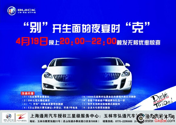 4月19日晚上20:00-22:00,2014年度的別克夜宴隆重登場,為您展開一場“別開生面”的特別購車行動,店內(nèi)君威現(xiàn)車銷售,顏色可選,觸發(fā)無限的優(yōu)惠驚喜,優(yōu)惠幅度絕對無法想象。詳詢玉林弘通別克4S店0775-2295666 |