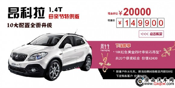 昂科拉1.4T母親節(jié)特供版套裝(限時2014年5月11日前):是以2014款昂科拉1.4T自動兩驅(qū)都市精英型為基礎,加裝嵌入式導航、倒車攝像頭、日間行車燈、后備箱防擦條、動感鉚釘油箱蓋以及一體式登車踏板和多處鍍鉻飾條等,總計10多項實用增配,不僅增加了整車的炫酷動感,而且對行車安全和舒適便利也有扎實的提升,令這款特供版昂科拉相當超值。下定即享: 1、價值2400元“周生生18K紅色黃金四葉草鉆石吊墜”共20個獲獎機會(購車可兌換) 2、前500位購車客戶可獲得價值1500元限量戶外大禮包