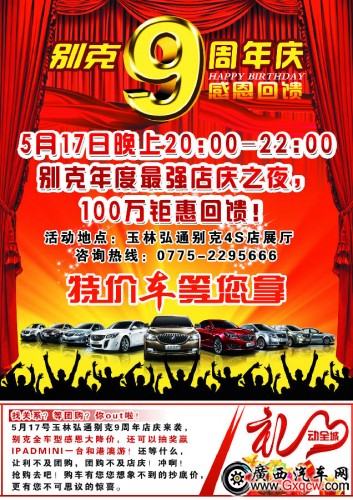 5月17號(hào)玉林弘通別克9周年店慶來(lái)襲,別克全車(chē)型感恩大降價(jià),還可以抽獎(jiǎng)贏IPADMINI一臺(tái)和港澳游!