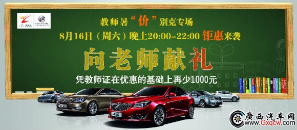 2014年8月16日(星期六)晚上20:00-22:00,凡教師到我店購買別克全系任意車型,我店均給予教師購車巨大優(yōu)惠的基礎(chǔ)上憑教師證再少1000元。除了車型優(yōu)惠外,我店還為老師們提供新車咨詢、二手車置換、金融貸款、保險、汽車裝飾、美容、保養(yǎng)維修及安全知識等相關(guān)咨詢服務(wù)。