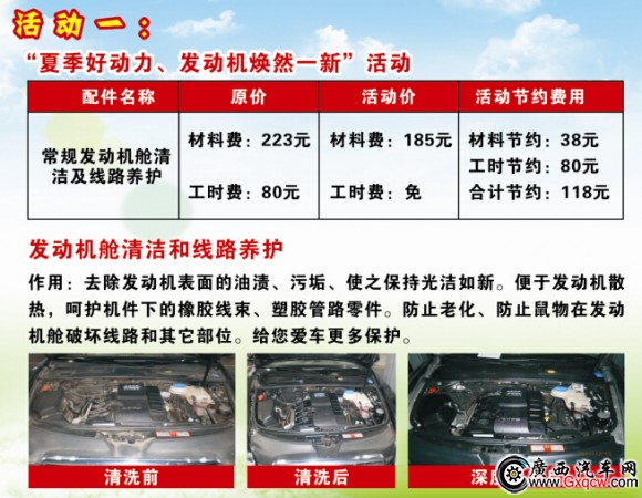 活動(dòng)期間,進(jìn)店進(jìn)行常規(guī)發(fā)動(dòng)機(jī)艙清洗及線路養(yǎng)護(hù)等都可以享受材料費(fèi)現(xiàn)金折讓和工時(shí)費(fèi)免費(fèi)待遇。