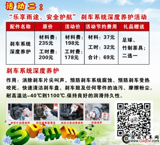活動(dòng)期間,進(jìn)店進(jìn)行剎車(chē)系統(tǒng)深度養(yǎng)護(hù)可享受材料費(fèi)和工時(shí)費(fèi)現(xiàn)金折讓的活動(dòng)待遇,同時(shí)還有禮品贈(zèng)送。