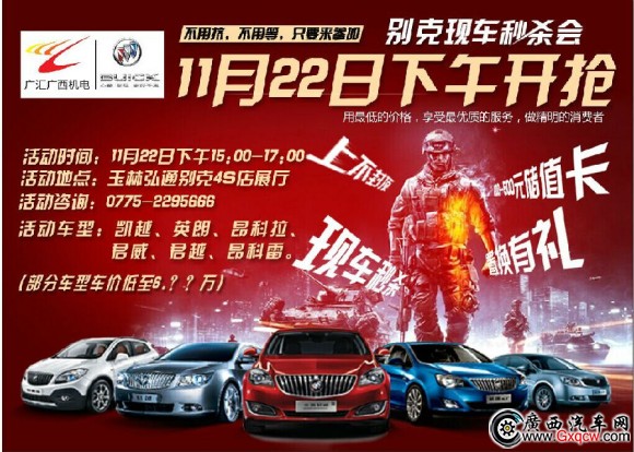 冬天送暖價啦!玉林弘通別克4S店2014年11月22日(星期六)下午15:00-17:00舉辦別克現(xiàn)車秒殺會,別克全系車型超低價限時秒殺,僅限2小時!秒殺熱線:0775-2295666