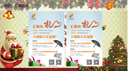為了感恩回饋廣大客戶,匯通租賃(原廣匯租賃)傾情推出“匯購有禮,相約冬日”冬季感恩雙重禮遇活動(dòng)。2014年12月1日—2014年12月31日活動(dòng)期間,凡前往匯通信誠500余家4S店和綜合展廳、200余家二手車經(jīng)銷商商戶成功分期購車的客戶,可獲得由匯通信誠送出的限量版移動(dòng)電源或定制版晴雨傘,這個(gè)冬天,我們和你一起相伴溫暖到底。