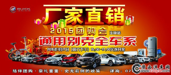 2015年1月17日15:00-17:00,玉林弘通別克廠家直銷史上最強團購會,2014農(nóng)歷年*后一波鉅惠2015新歷年**波鉅惠,團購火爆招募中!*低價格、最全車型、優(yōu)惠等著你!活動結(jié)束后不再享受此次通用別克廠家特惠價格。詳詢玉林弘通0775-2295666