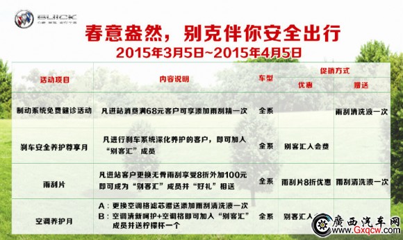 羊年春天的腳步已經(jīng)走近,不少車主朋友又到了駕駛愛車出行踏青的時候。萬物復(fù)蘇少不了綿綿春雨的滋潤,冬季后的愛車也需要一次精心的養(yǎng)護(hù)。為此玉林弘通別克4S店傾情為廣大車主朋友開展“春意盎然,別克伴你安全出行”的主題活動,為廣大車主春季踏青出行及雨天行車提供安心的養(yǎng)護(hù)。詳情請洽玉林弘通別克4S店售后服務(wù)部0775-2293663
