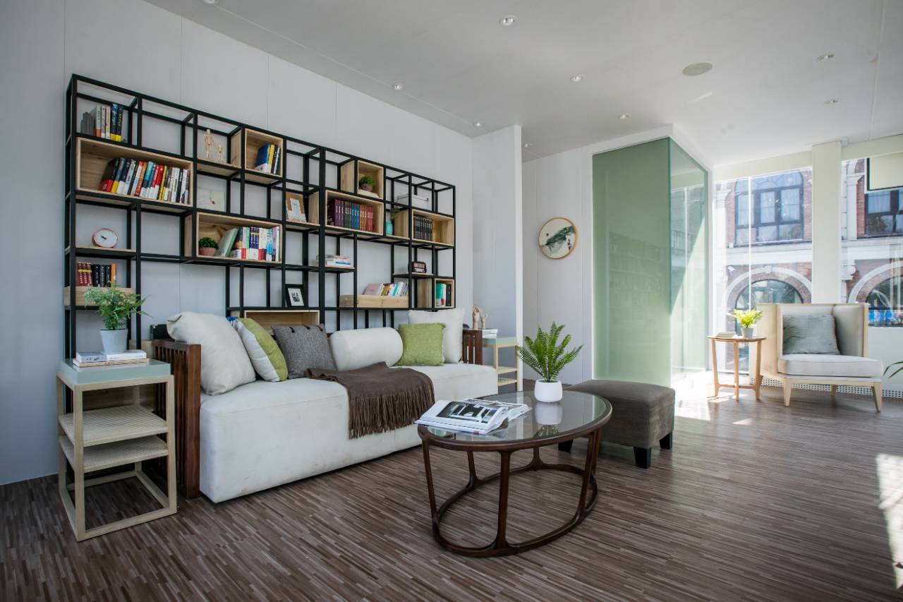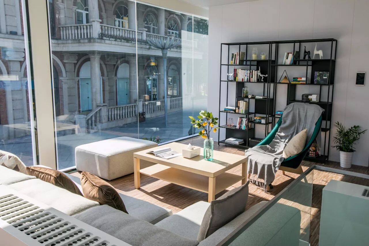 不同于上海和杭州,「美好屋托邦·武漢」從一幢可以生活居住的體驗房屋,搖身一變,成為一棟踐行智能科技與環(huán)保設計理念的兩層書屋。在這個公共空間里,愛書人能充分感受到“閱讀”的美好——陽光暖暖地照進來,書屋里優(yōu)雅簡約的裝潢配上原木的家具,舒適的沙發(fā)上配著軟軟的靠墊。周圍溫度、濕度適宜并能根據(jù)外部環(huán)境自動調節(jié),新風系統(tǒng)隨時灌入新鮮的空氣。書架隨處可見,分門別類放著文學、歷史、人物傳記、哲學名著……你可以找到自己喜歡的書籍,找一個無人打擾的角落細細品讀,也可以帶著自己覺得美好的書籍,與屋內的圖書進行交換,傳遞這份“美好”;或是和其他愛書之人一起享受閱讀,交流心得,共同暢想美好生活。
