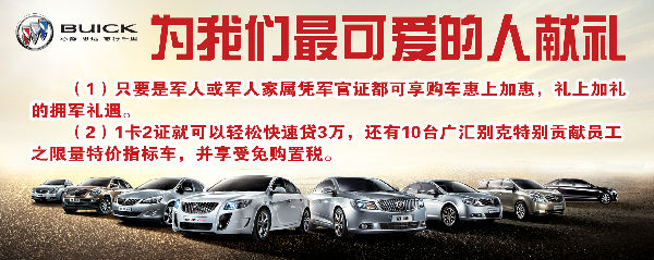 2012年8月1日,為慶祝中國人民解放軍建軍83周年重大節(jié)日,玉林弘通別克4S店把*優(yōu)惠的價(jià)格獻(xiàn)給我們最可愛的人,于8月1日―30日在4S店舉行“為我們最可愛的人獻(xiàn)禮”促銷讓利活動(dòng),只要是軍人或軍人家屬憑軍官證都可享購車惠上加惠,禮上加禮的擁軍禮遇。除此之外,您只要1卡2證就可以輕松快速貸3萬,還有10臺(tái)廣匯別克特別貢獻(xiàn)員工之限量特價(jià)指標(biāo)車,并享受免購置稅。機(jī)不可失時(shí)不再來,還等何時(shí)?詳情請(qǐng)洽玉林弘通別克4S店:0775―5808880