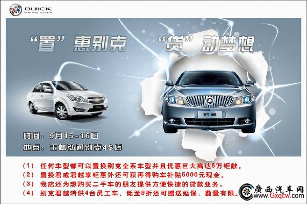 9月15-16日“不怕您不來(lái),就怕不來(lái)您后悔!”,玉林弘通別克4S店恭候您的光臨!詳詢:0775―2295666 地址:廣西玉林市教育東路31號(hào)