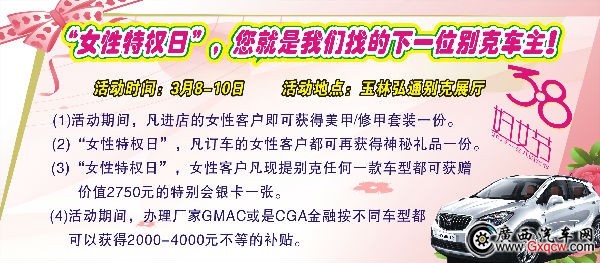 2013年3月8-10日,玉林弘通別克4S店將開放“女性特權(quán)日”,活動(dòng)期間,女性客戶或是女性車主到店看車訂車購車均有好禮相送,也許您就是我們要尋找那一位特別的別克車主,尊享我們的“女性特權(quán)日”。