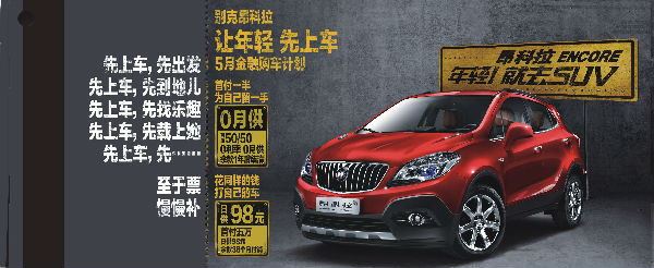 別克昂科拉"讓年輕先上車"5月金融購車計劃全面啟動, 5萬就能把車開回家,更有0月供0利率,各種金融方案各種選!先上車先出發(fā)先上車先找樂子,更多金融方案,請洽玉林弘通別克4S店:0775-2295666