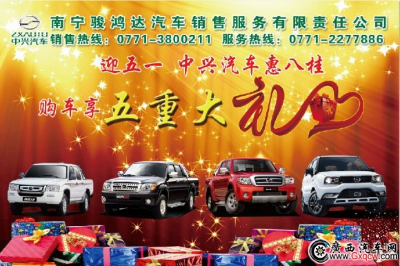 5月1日-5月3日,第二十三屆廣西汽車交易會(huì)暨安吉車展將在廣西汽車市場盛大舉行。南寧駿鴻達(dá)將攜中興汽車各款車型(旗艦A9、威虎G3、威虎T3)、廣汽中興C3商務(wù)版、導(dǎo)航版、至尊版亮相安吉車展,活動(dòng)期間購中興汽車即享五重大禮:*高優(yōu)惠6000元;送2000元大禮包;更可獲贈(zèng)價(jià)值2000元的筆記本電腦/冰箱;購車現(xiàn)場抽大獎(jiǎng);老帶新購車更可獲雙重禮品!現(xiàn)場更有上車找錢和掃微信活動(dòng),歡迎廣大市民參與!