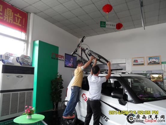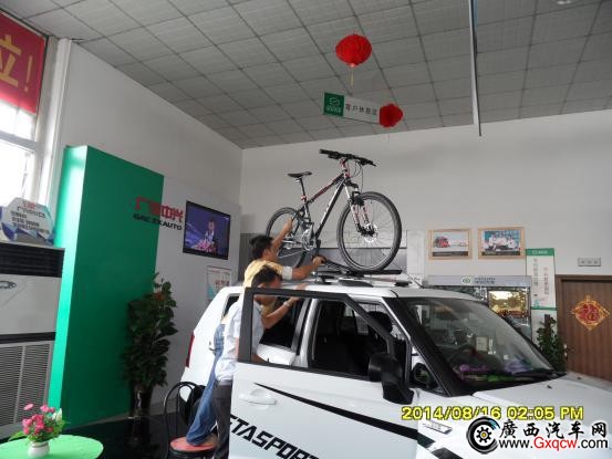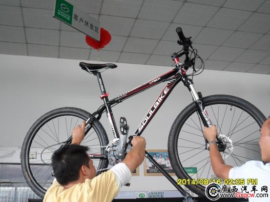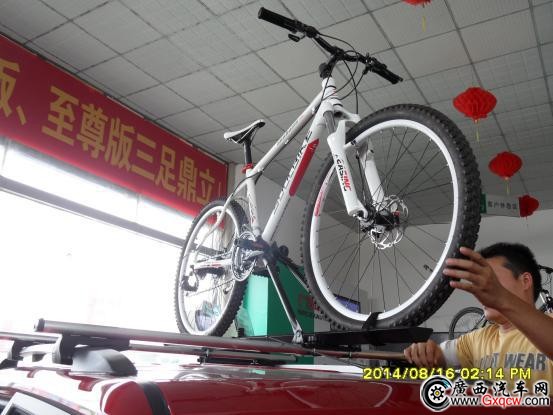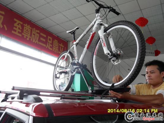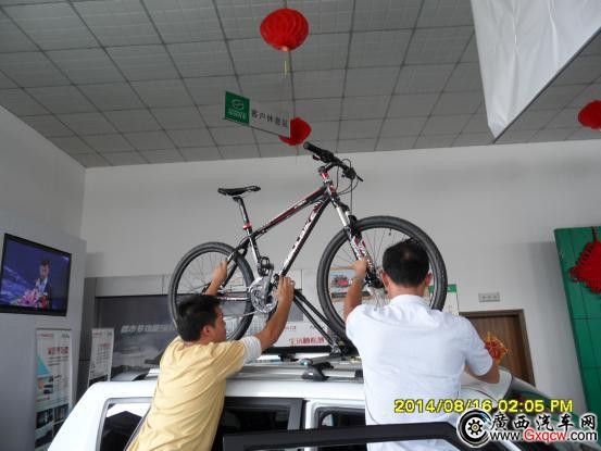 **步,兩個人將車抬上車頂,將前后車輪置于行李加上的自行車專用架槽里: