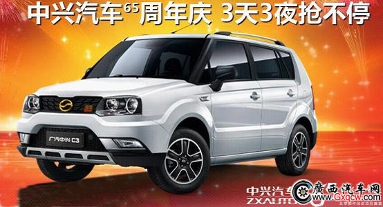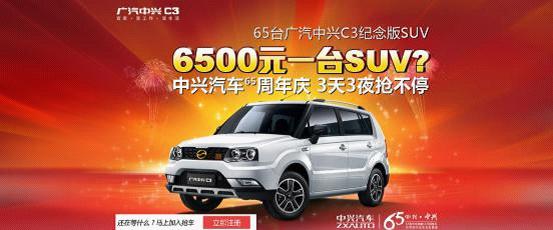 為慶祝建廠65周年,中興汽車將在近期推出“中興C3紀(jì)念版SUV搶車”活動。參與活動即有機會以6500元的史上*低價格,搶得價值63800元的廣汽中興C3六十五周年廠慶紀(jì)念版SUV一臺。您沒有看錯,就是6500元,趕快來參加吧。