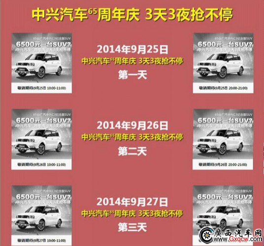 中興汽車始于1949年,到2014年已有65年歷史。值此65周年大慶,中興汽車推出6500元搶一臺(tái)SUV。