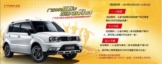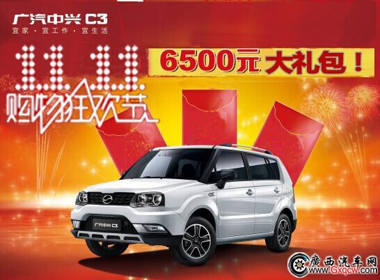 雙11網(wǎng)絡(luò)購(gòu)物節(jié)即將到來(lái),為了讓廣大消費(fèi)者共享這個(gè)網(wǎng)絡(luò)饕餮盛宴,南寧駿鴻達(dá)特推出“百團(tuán)大戰(zhàn)購(gòu)C3享豪禮”雙11團(tuán)購(gòu)會(huì)。即日起至11月11日,不管您通過(guò)網(wǎng)絡(luò)報(bào)名(汽車之家、易車網(wǎng)、搜狐汽車、中興汽車官網(wǎng))或者到南寧駿鴻達(dá)店面報(bào)名訂購(gòu)廣汽中興C3商務(wù)版,均可享受廣汽中興C3廠家團(tuán)購(gòu)優(yōu)惠或南寧駿鴻達(dá)6500元大禮包!歡迎感興趣的朋友來(lái)店/電咨詢!