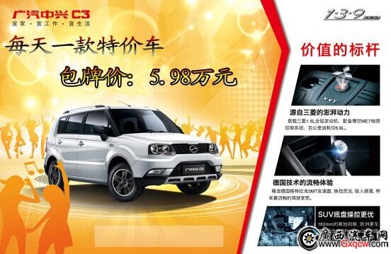 為了答謝廣大消費(fèi)者對“廣汽中興狂歡季 百團(tuán)大戰(zhàn)購C3”活動(dòng)的大力支持,南寧駿鴻達(dá)特推出“廣汽中興C3每天一款特價(jià)車”的活動(dòng)。從2014年11月12日起至2014年11月30日每天推出一款特價(jià)車:包牌價(jià)只要59800元,就可以把廣汽中興C3開回家!
