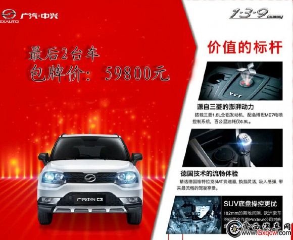 年末鉅惠,南寧駿鴻達推出廣汽中興C3特價車:包牌價只要59800元,就可以把廣汽中興C3開回家!僅有*后2臺車,先到先得!