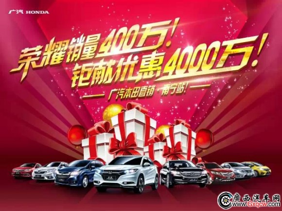 廣汽本田榮耀銷量400萬,鉅獻優(yōu)惠4000萬,廣汽本田優(yōu)惠多多、禮品多多。只要您購買廣汽本田任何一款車型,即可參與抽獎活動,多重豪禮100%中獎,您還在猶豫什么? 趕快撥打我們的活動熱線咨詢吧!0776-2882000