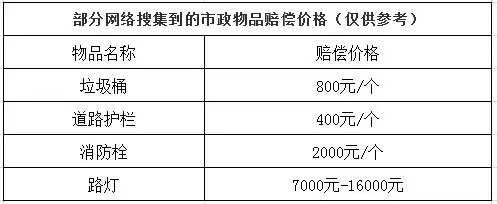 像上面因?yàn)槭鹿识矚Я耸姓锲返陌咐,網(wǎng)絡(luò)上一搜一大堆。賠償價(jià)格也都高得嚇人,以下是小編通過網(wǎng)絡(luò)搜集到的部分市政物品賠償價(jià)格,僅供參考及警示作用。