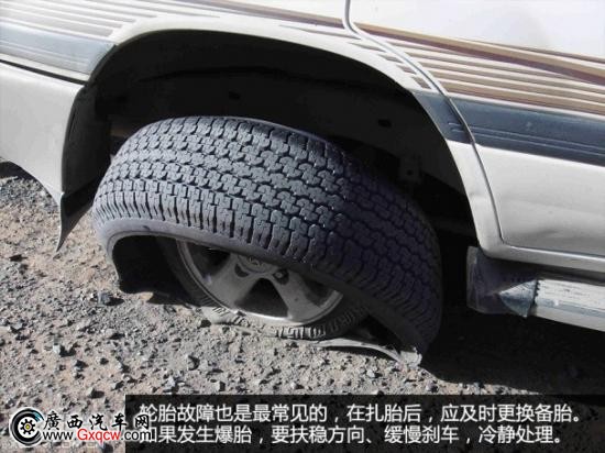 輪胎故障也是車輛最常見故障之一,在扎胎后,應(yīng)及時(shí)更換備胎,有條件的話,應(yīng)及時(shí)補(bǔ)胎。如果是缺氣保用胎(防爆胎),雖然漏氣的情況下可以繼續(xù)行駛,但還是建議及時(shí)去補(bǔ)胎或處理,以免對輪胎造成傷害。如果車輛在行駛時(shí)爆胎,切不可猛踩剎車、猛打方向,扶穩(wěn)方向、緩慢剎車,冷靜處理。待車輛停穩(wěn)后,再更換備胎或聯(lián)系救援。