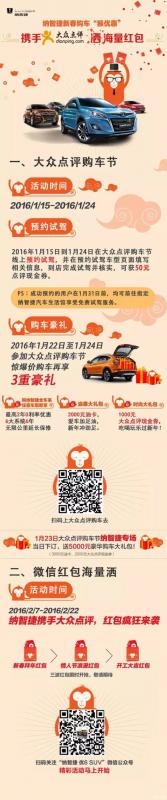 除了“購車節(jié)”的優(yōu)惠促銷,消費(fèi)者關(guān)注納智捷優(yōu)6SUV官方微信,指定活動期間,參與微信互動活動,即可贏取納智捷派發(fā)的大眾點(diǎn)評現(xiàn)金紅包,可在大眾點(diǎn)評APP內(nèi)消費(fèi)抵扣使用。其中包括:2月7日-2月9日的新春拜年紅包,以及2月14日-2月16日的情人節(jié)浪漫紅包,還有2月20-2月22日的開工吉祥紅包。紅包多多,送不停。