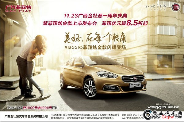 金壯源一周歲生日party ,菲翔土豪金上市會,浪漫意大利風(fēng)情之夜,盡在11月23日晚20:00廣汽菲亞特南寧金壯源4S店廣場(壯錦大道與國凱大道交匯處機場那洪收費站旁)歡歌盛舞,美食紅酒,香車美女,與您共度良宵,敬請期待。