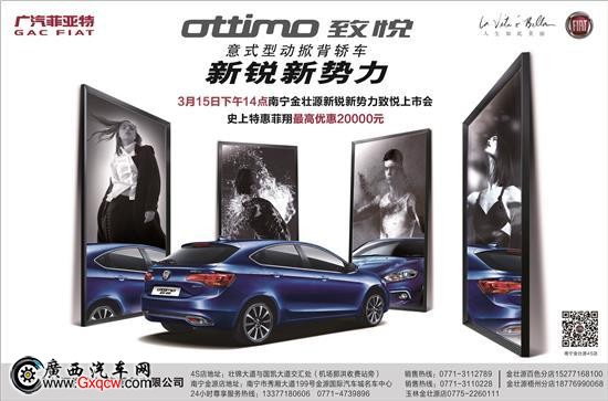 廣汽菲亞特Ottimo致悅將于3月15日在廣汽菲亞特南寧金壯源上市,純正意式掀背風(fēng)潮觸手可及,到場(chǎng)即可領(lǐng)取精美禮品,現(xiàn)場(chǎng)還有神秘活動(dòng)!將為您打造一個(gè)不一樣的3·15視覺(jué)盛宴。