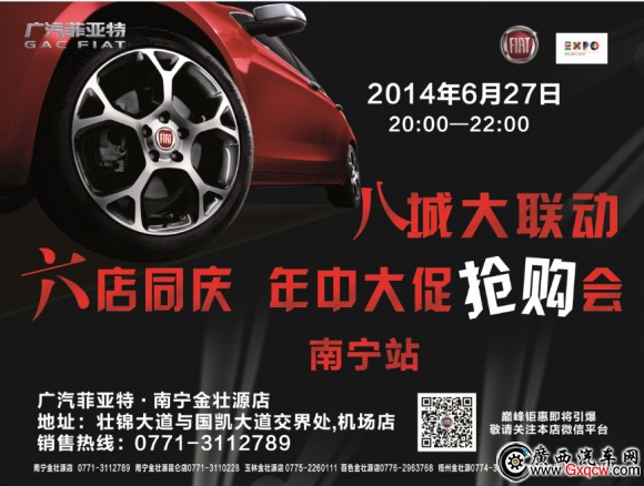 6月27—6月29日廣汽菲亞特南寧金壯源店世界杯沖擊波洶涌來襲,8大城市聯(lián)動,橫跨湘桂兩省,南寧、玉林、百色、梧州、貴港、北海、防城、株洲6店年中大促,0利率,0利潤銷售。巔峰鉅惠,即刻引爆!