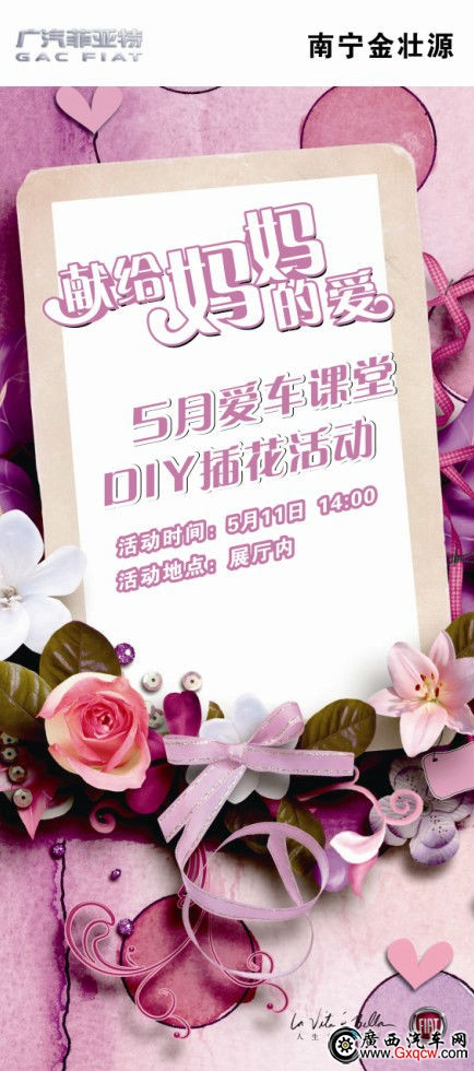 5月11日本周六下午兩點!南寧金壯源5月愛車課堂又開課啦!本周主題是:“獻給媽媽的愛”!本次課堂不僅可以學到新車的保養(yǎng)和用車知識,還有現(xiàn)場的DIY插花活動哦!在母親節(jié)送上自己親自插的一份花籃,還有什么比這份禮物更能表達對母親的愛呢!周末到店試駕的客戶還可以領取菲亞特母親節(jié)賀卡一張哦!
