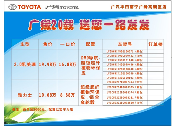 “廣緣感恩20載”廣汽豐田南寧廣緣高新區(qū)店7月6-7日,廣汽豐田全車系冰點價,凱美瑞16.88萬輕松“開”回家(還送DVD導(dǎo)航),雅力士1.6萬“貸”回家。推薦好友購車還有千元券贈送哦!給你過一個清爽的夏季,想買車的朋友,心動就趕快行動吧!讓您這個夏天沁爽到底!廣緣高新區(qū)店還精心為您準(zhǔn)備了各種感恩好禮,感興趣的朋友趕緊到店一起來分享的購車驚喜!