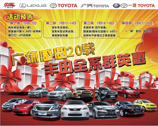 大集團(tuán)才有大優(yōu)惠!廣緣集團(tuán)旗下一汽豐田、廣汽豐田、雷克薩斯在廣緣廣豐店吹響集結(jié)號。2013年7月10日-30日,三大品牌齊聚廣汽豐田南寧廣緣高新區(qū)店。經(jīng)濟(jì)代步車、商務(wù)高檔車、豪華轎跑,應(yīng)有盡有,團(tuán)購的價(jià)格,展廳舒適化的享受!豐田全系,就在這里!