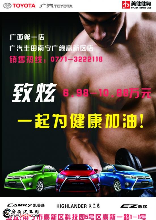 現(xiàn)在追求健康時(shí)尚的生活,3月19日 致炫 邀你一起為健康加油!廣汽豐田南寧廣緣高新區(qū)店攜手美健健身會(huì)所為生活添彩。 還等什么呢?還有更多的驚喜和優(yōu)惠等著您!趕快來體驗(yàn)人車生活的無限樂趣吧!
