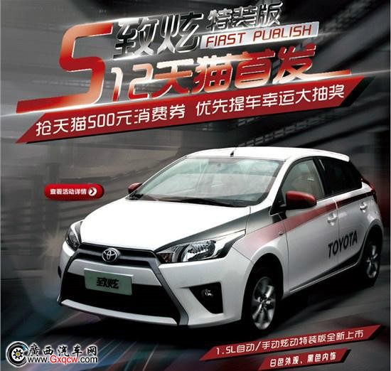 一、天貓下定,搶天貓消費(fèi)券: 2014年5月12日-7月30日,前100名在廣汽豐田官方旗艦店付198元定金,并在7月30日之前成功購買致炫特裝版的用戶,即可獲得500元天貓消費(fèi)券。 廣汽豐田官方旗艦店在收到提車4S店提交的轉(zhuǎn)款協(xié)議,并在用戶確認(rèn)收貨之后,向用戶發(fā)放500元天貓消費(fèi)券。 500元天貓消費(fèi)券可在天貓商城購買商品時(shí)使用。