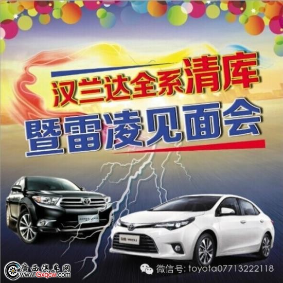 廣汽豐田廣西**店南寧廣緣店【漢蘭達全系清庫暨雷凌見面會】盡在周末呈現。漢蘭達超低清庫價,一臺不留清庫獻禮,火熱搶購中!超低首付,讓您輕松購車,即可一“部”到位開回家,價格勁爆!雷凌現車搶不停!車源同城最豐富,您還等什么呢?趕快把您的愛車帶回家!