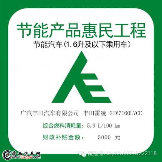 國家發(fā)改委、工信部和財政部聯(lián)合發(fā)布新一輪關(guān)于開展1.6升及以下節(jié)能環(huán)保汽車推廣工作的通知,并發(fā)布“節(jié)能產(chǎn)品惠民工程節(jié)能環(huán)保汽車(1.6升及以下乘用車)推廣目錄(**批)公告?上驳氖,廣汽豐田的新寵——雷凌入圍此次名單,雷凌1.6G、1.6GL 的CVT車型尊享國家3000元節(jié)能惠民補貼!讓觀望的客戶更有了購買的動力,環(huán)保、動力、優(yōu)惠,都不妥協(xié)!