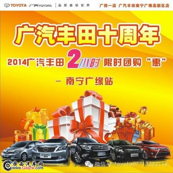 廣汽豐田南寧廣緣高新區(qū)店限時搶購2小時!10月18日團購會震撼來襲,打破您的想象!“花一天時間,省一年憂慮”,團購全部車型現(xiàn)場公布價格,階梯式降價,達到數(shù)量立即降價,再次達到繼續(xù)降價,降價額度上不封頂,團得就是心跳,讓您跟著尖叫!