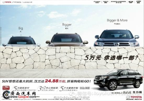 在進(jìn)入年終購(gòu)車(chē)最激烈的競(jìng)爭(zhēng)階段之時(shí),中高端SUV車(chē)市迎來(lái)一枚重磅炸彈。2014年11月01日,廣汽豐田正式推出史上最強(qiáng)金融購(gòu)車(chē)方案“漢蘭達(dá)好易購(gòu)”。此次活動(dòng)是專(zhuān)門(mén)針對(duì)漢蘭達(dá)車(chē)型開(kāi)展的專(zhuān)項(xiàng)金融活動(dòng),將為消費(fèi)者提供史上最便捷、優(yōu)惠的購(gòu)車(chē)服務(wù)。即日起至12月31日,凡購(gòu)車(chē)客戶(hù)參與活動(dòng),即可享受5萬(wàn)超低首付、5年超長(zhǎng)質(zhì)保,5千置換補(bǔ)貼,讓您輕輕松松,“貸”走漢蘭達(dá)!