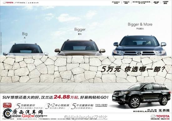 廣汽豐田南寧廣緣高新區(qū)店漢蘭達清庫大行動,目前正式推出史上最強金融購車方案“漢蘭達好易購”。此次活動是專門針對漢蘭達車型開展的專項金融活動,將為消費者提供史上最便捷、優(yōu)惠的購車服務。即日起至12月31日,凡購車客戶參與活動,即可享受5萬超低首付、5年超長質(zhì)保,5千置換補貼,讓您輕輕松松,“貸”走漢蘭達!