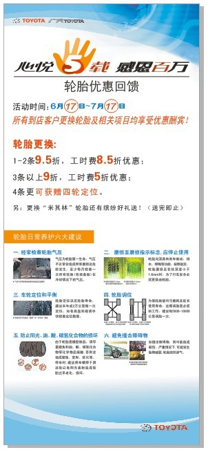 正值廣汽TOYOTA渠道品牌成立五周年,“心悅服務(wù)”品牌發(fā)布一周年,借此時(shí)機(jī),廣汽豐田廣緣店于6月17-7月17日開展輪胎優(yōu)惠回饋活動(dòng)。所有到店更換輪胎及相關(guān)項(xiàng)目均享受優(yōu)惠酬賓。