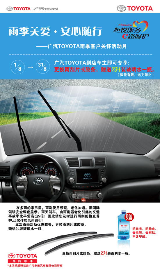 在多雨的季節(jié)里,雨刮使用頻繁,老化加速。據(jù)國際駕駛安全調(diào)查顯示:雨季駕車,由雨刮器老化引起的交通事故比常高出5倍!因此請您及時進行雨刮的檢查養(yǎng)護,讓它伴您風(fēng)雨通行!8月1-31日廣汽到店車主即可專享:更換雨刮片或膠條,贈送2升玻璃水一瓶。(數(shù)量有限,送完即止)