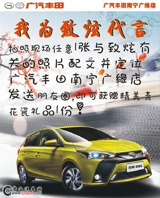 活動當天,只要您拍現(xiàn)成任意一張與致炫有關的照片配文我為致炫代言并定位廣汽豐田南寧廣緣店發(fā)送朋友圈(微博、空間)即可獲得精美青花瓷禮品一份!