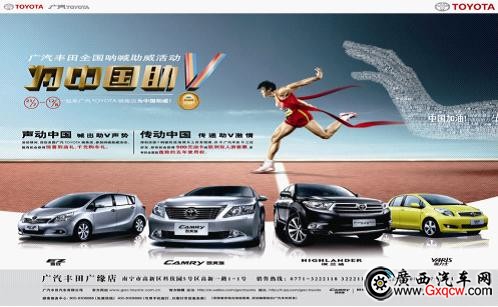 根記者從廣汽豐田南寧廣緣高新區(qū)店了解到,廣汽豐田廣緣店正在舉辦為中國加油,為奧運吶喊助“V”,活動,只要你到南寧廣緣高新區(qū)店參與中國加油,為奧運吶喊助“V”,將獲贈高級禮品一份,活動期間推出更多的購車優(yōu)惠活動,價驚全城。