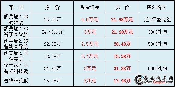 大集團(tuán)才有的大優(yōu)惠9月29日-10月2日安吉車展優(yōu)惠席卷而來,廣汽豐田廣緣店為答謝新老客戶對我們的信賴支持,現(xiàn)凱美瑞*高綜合現(xiàn)金優(yōu)惠4.5萬元,再送3年盜搶險(xiǎn),漢蘭達(dá)*高優(yōu)惠3萬元,逸致*高優(yōu)惠2萬元,且在車展期間展廳優(yōu)惠與車展現(xiàn)場同步,不用擠車展,展廳輕松舒適購愛車,如此的優(yōu)惠,您還需要等嗎?趕快行動吧!