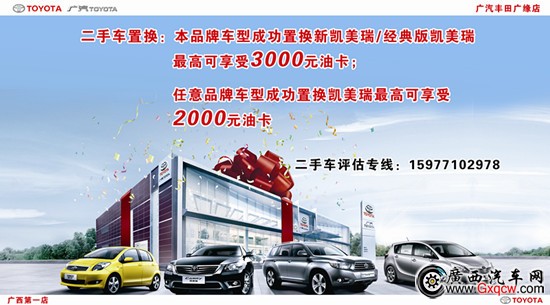 現(xiàn)參與二手車置換活動凡是廣汽豐田車型成功置換新凱美瑞/經(jīng)典版凱美瑞*高可享受贈送3000元油卡;任意品牌車型成功置換凱美瑞*高可享受贈送2000元油卡。