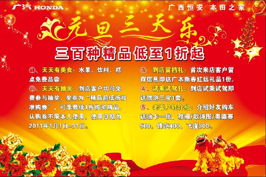 3、到店留檔禮:首次來(lái)店客戶留存信息即送廣本新春紅運(yùn)禮品1份。